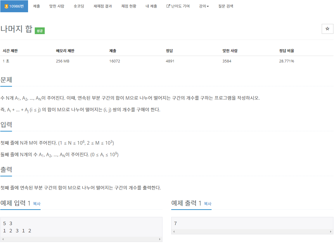 그렇다면, 만약 x = 1부터 N 까지 순서대로 입력받으면서 누적합을 구하고, 모든 x 위치에서의 [1, x]의 구간합을 M으로 나눈 나머지를 알고 있다면 어떨까? 현재 x값에 대해 누적합을 M으로 나눈 나머지와 동일한 값이 이전에 나왔던 경우의 수를 세면 이 문제의 답을 구할 수 있을 것이다.