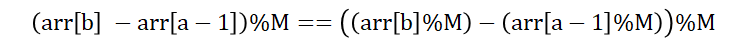 이 때, 문제 조건에 따라 좌변이 0이 되어야 하므로, 우변 또한 0이 되어야 하고, '(arr[b]%M) - (arr[a-1]%M) == 0' 이라고 할 수 있다. 따라서 구간 [a, b]에 대해 'arr[b]%M == arr[a-1]%M' 이라면 [a, b]의 구간합은 M으로 나누어 떨어진다.