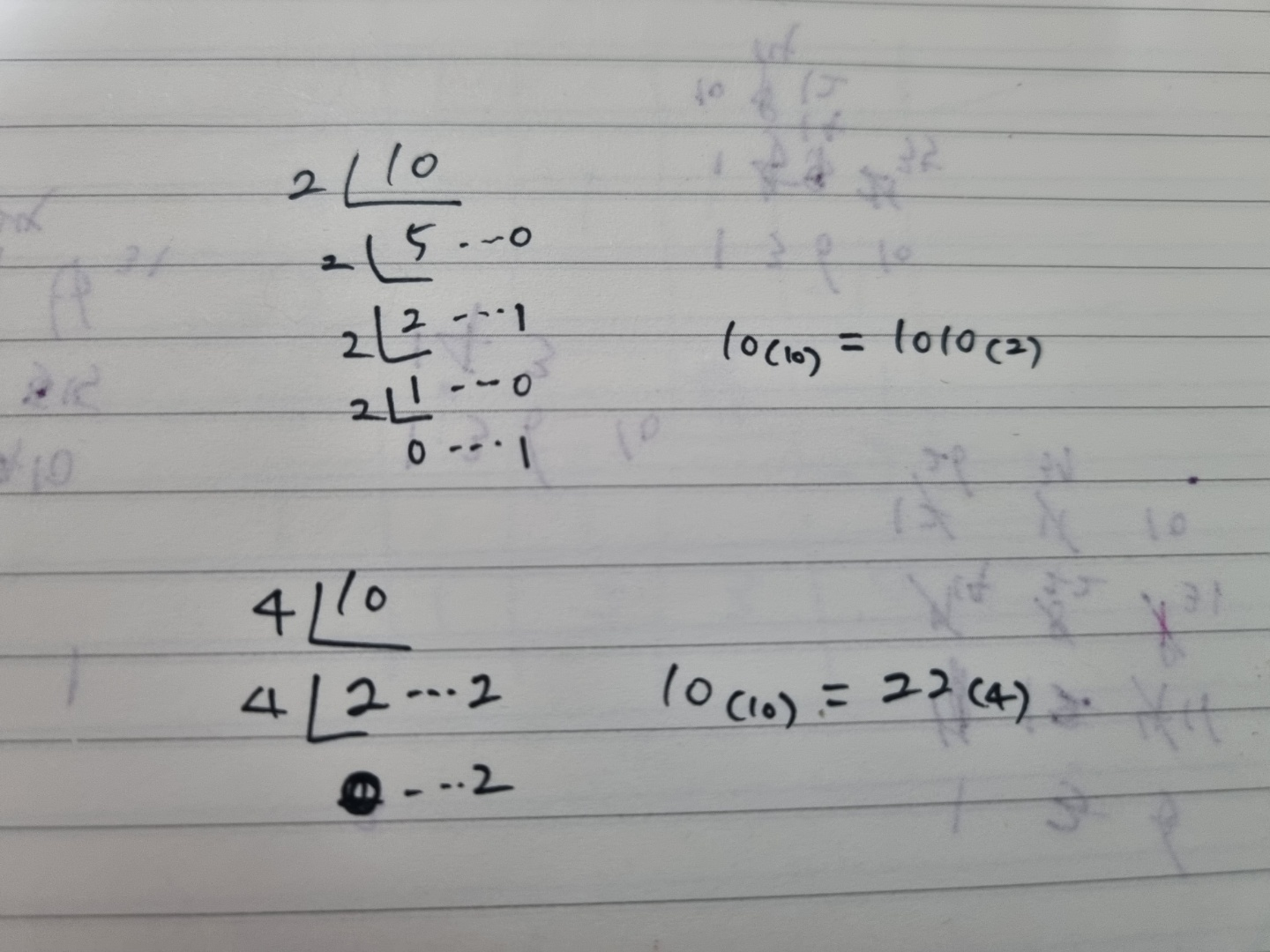 D부터 역순으로 이어붙이면 1010이 되고 이게 2진법으로 바꾼 결과이다. 마찬가지로 4진법으로 바꾸면 22가 된다.
