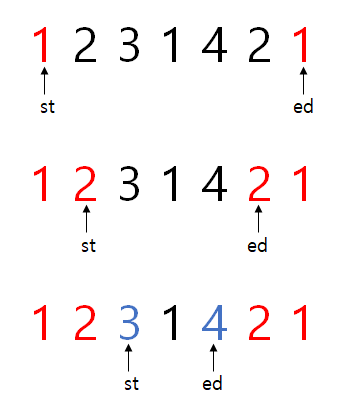 팰린드롬의 경우 가장 간단하게 판단하는건 맨앞과 맨뒤부터 하나씩 비교해보는 것이다. 이하 풀이에서는 인덱스값을 가지고 비교할 것이지만, 설명을 편히 하기 위해 맨앞을 포인터 st가, 맨뒤를 포인터 ed가 가리키고 있다고 해보자. '1231421'이 팰린드롬인지 판정할꺼다. 그럼 이하 그림처럼 진행되며, '3'과 '4'를 비교할 때 팰린드롬이 아님을 알 수 있게 된다. st<ed 인동안 이하를 진행하고, 모두 통과했다면 팰린드롬이다.