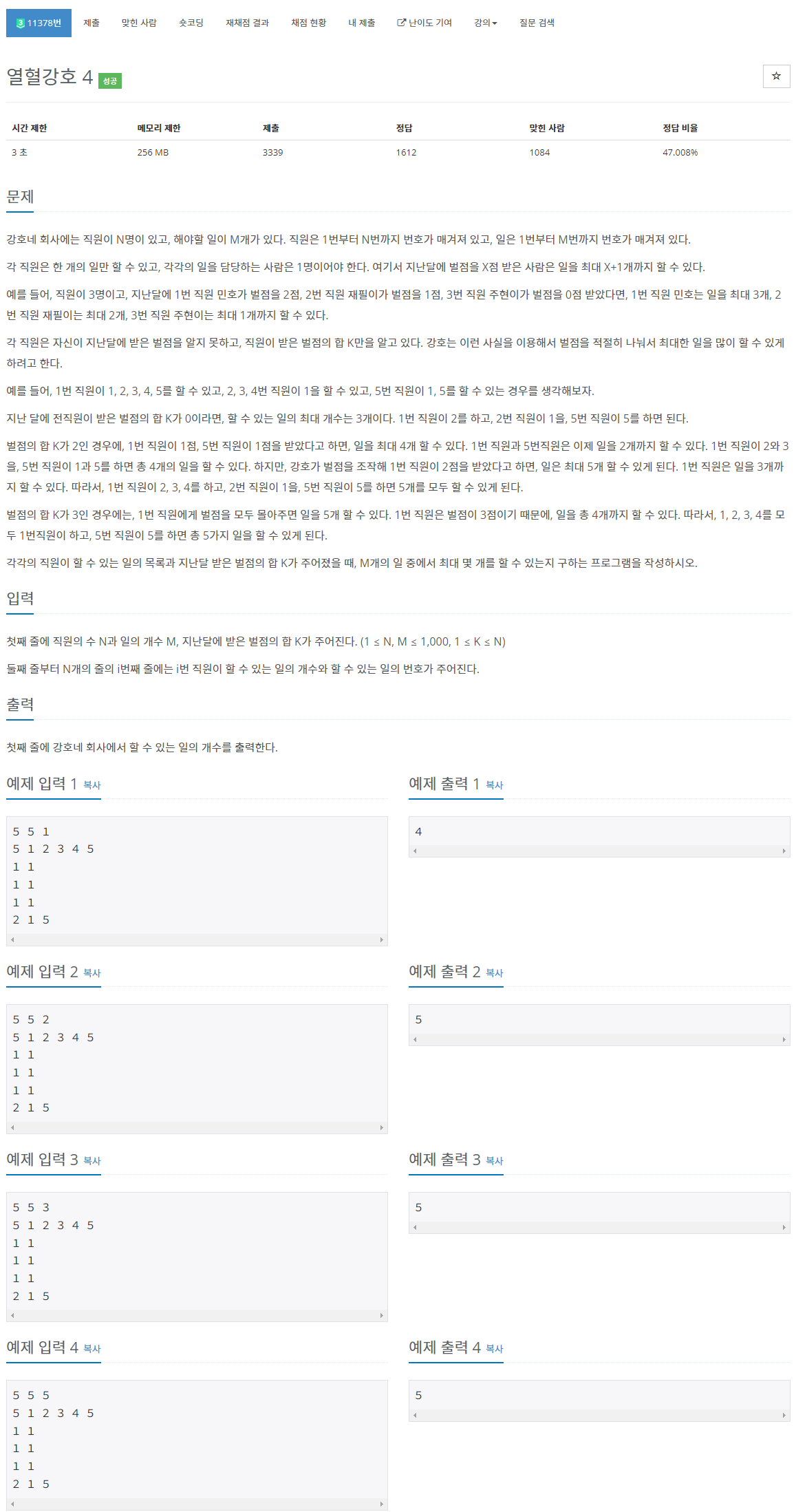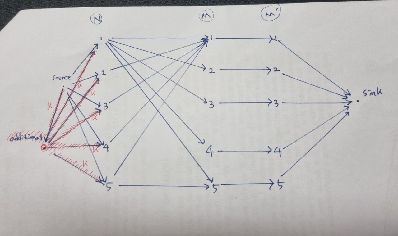 위의 방식들로 풀고나서 '난이도 기여'에 있는 aym506님의 "K개의 정점을 추가해서 이분 매칭을 시도하거나" 라는 멘트를 봤다. 좋은 아이디어 같아서 시도해보려고 했는데, 내 생각엔 k개의 추가 정점들은 M개의 일들한테 모두 간선을 그어주면 될 것 같았는데, 틀렸다고 떠서 감이 잘 안왔었다.