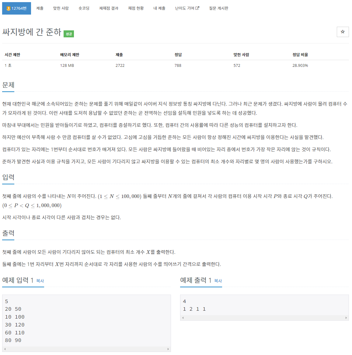 -> 우선 비어있는지를 알 수 있어야 한다. 이건 들어온 사람의 P보다, 이미 앉아있던 사람들의 Q가 더 작다면 (같은 경우는 없다는 조건이 있으므로 신경안써도 됨) 비어있다고 보면 된다.