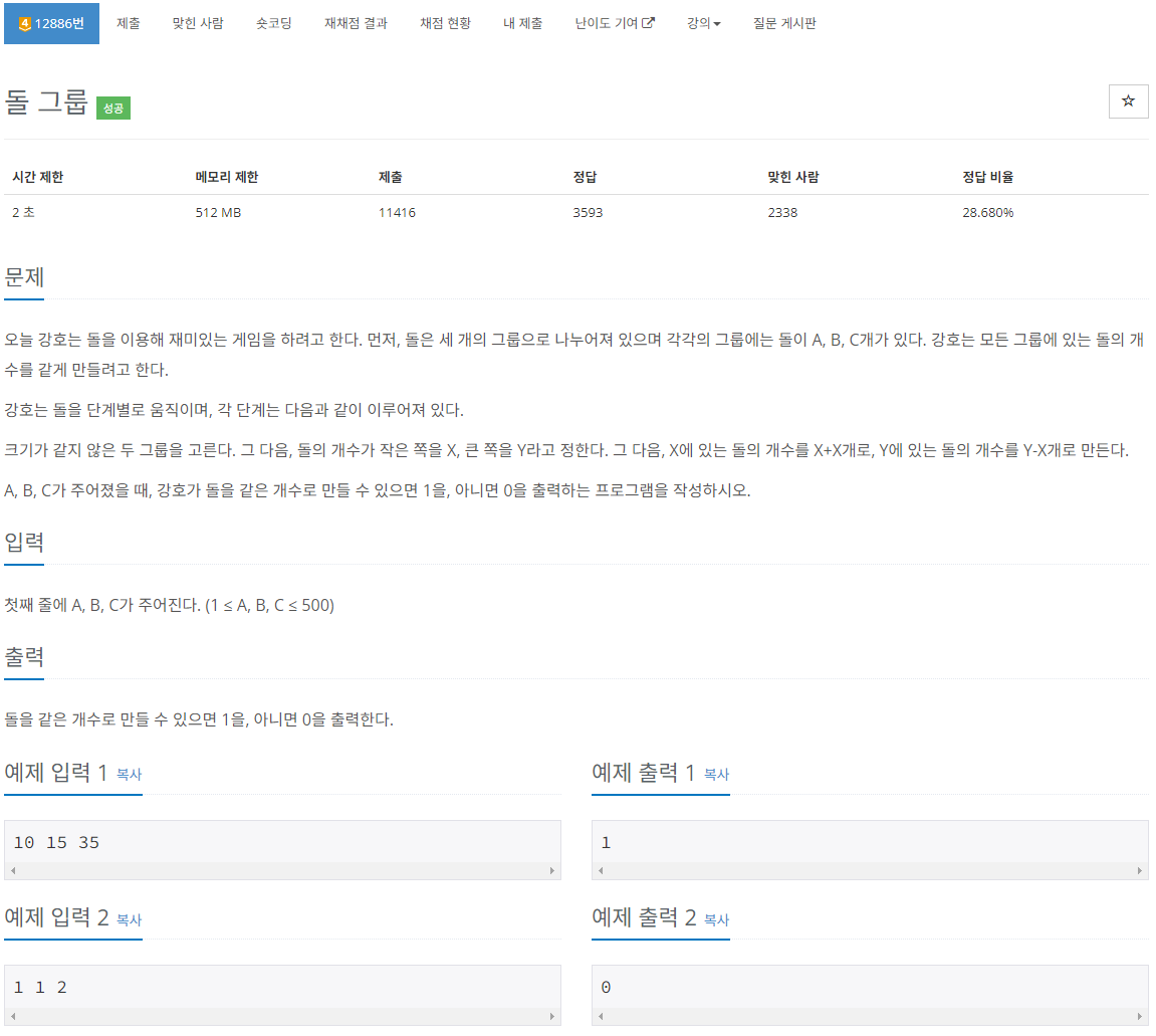 T=S/3 이라고 해보자. 이 때 방문체크 v[x][y]를 x돌과 y돌의 조합이 나온 경우라고 해보자. 이 경우 나머지 공 하나는 S-x-y 일 것이고, x==y==T 라면 정답이 존재하는 경우이다. 즉 모든 탐색 후 v[T][T] 가 존재했다면 1, 아니면 0을 출력하면 된다. bfs, dfs 등 아무 그래프 탐색 방식이나 써서 진행하면 된다.