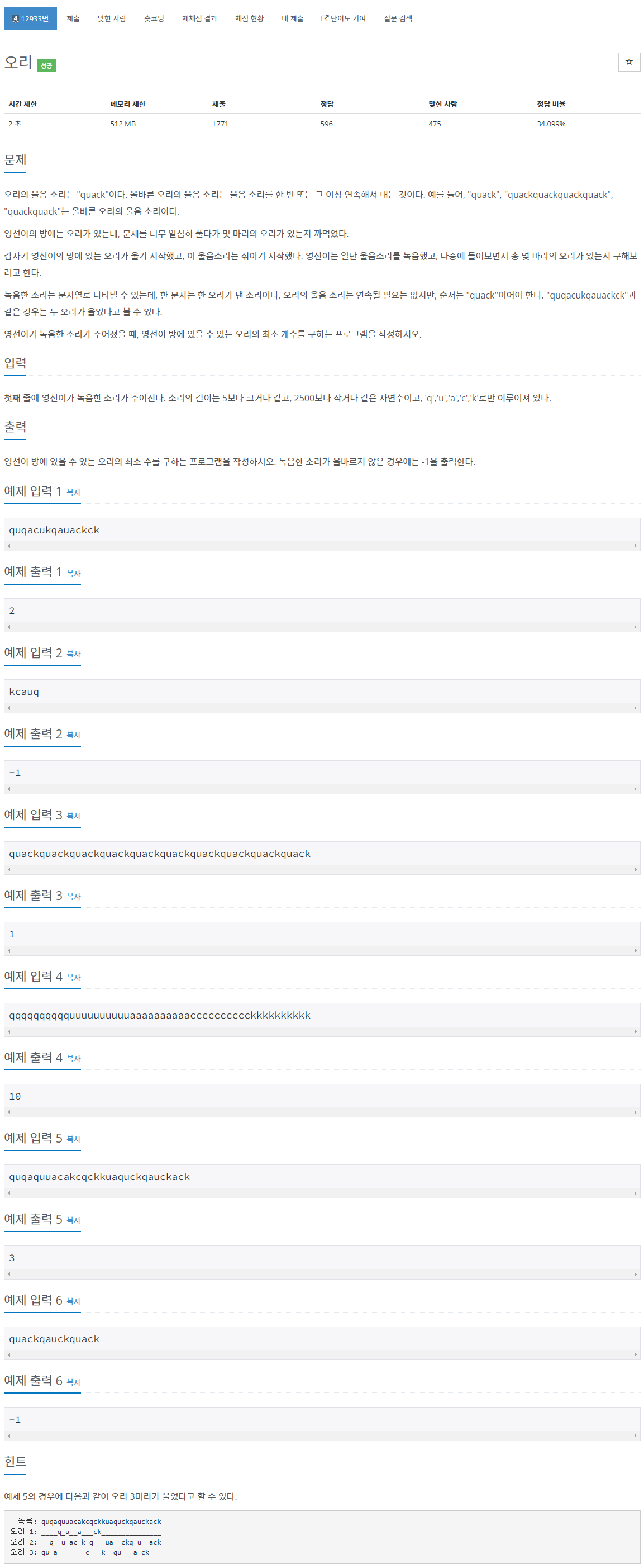 하지만 이 문제에서는 '오리의 최소 마리수'를 찾고자 하는것이므로, 여러 quack을 한 마리가 낼 수 있었다면 1마리로 칠 수 있다. 즉, quackquackquack 에 대해 한마리가 연속으로 3번 낼 수 있는 것이므로 1마리로 치면 된다. 이처럼 '최소 마리수'의 관점에서 문제를 이해하면 된다. 그럼 이하 몇가지 예시를 보자.