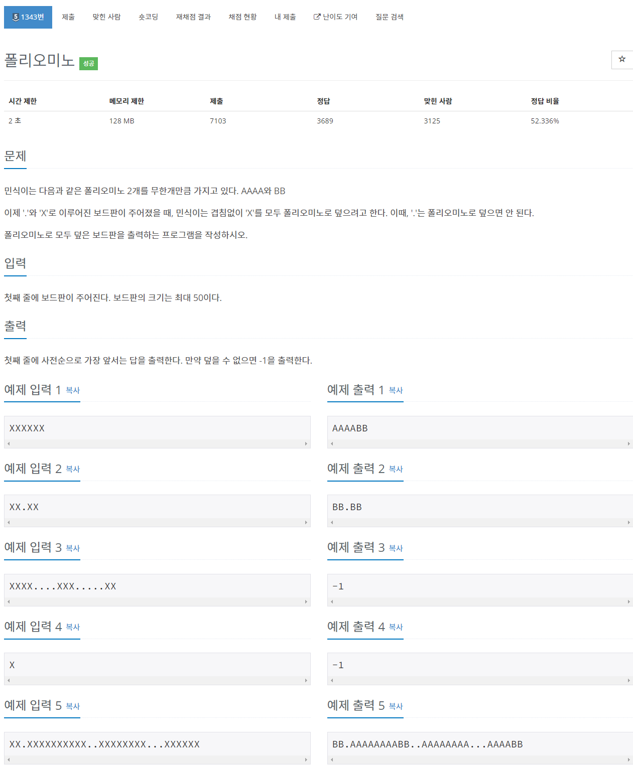 - 사전순으로 가장 앞서는 답을 출력해주기 위해, 각 연속된 X 집합들의 갯수를 기준으로 최대한 AAAA를 앞에 나오도록 해야 한다. 이런식으로 일정한 규칙을 정해 적용시키다보면 답이 나오는 그리디 문제이다.