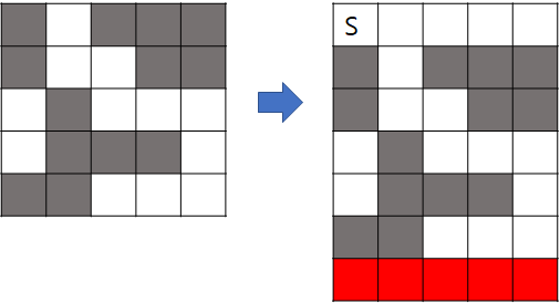 위에 추가한줄은 전부 흰색(0)으로 생각하고, 맨 아래줄은 별도로 목표점이라 지정해둔다. 그리고 새롭게 추가된 맨 윗줄 아무곳에서나 출발하면 된다. 그럼 기존 격자의 맨 윗줄 중 흰칸을 찾는걸 안해도 된다. 이제 새로운 맨 윗줄의 아무곳에서나 출발해서 저 빨간색 지점에 도착하는지만 보면 된다.