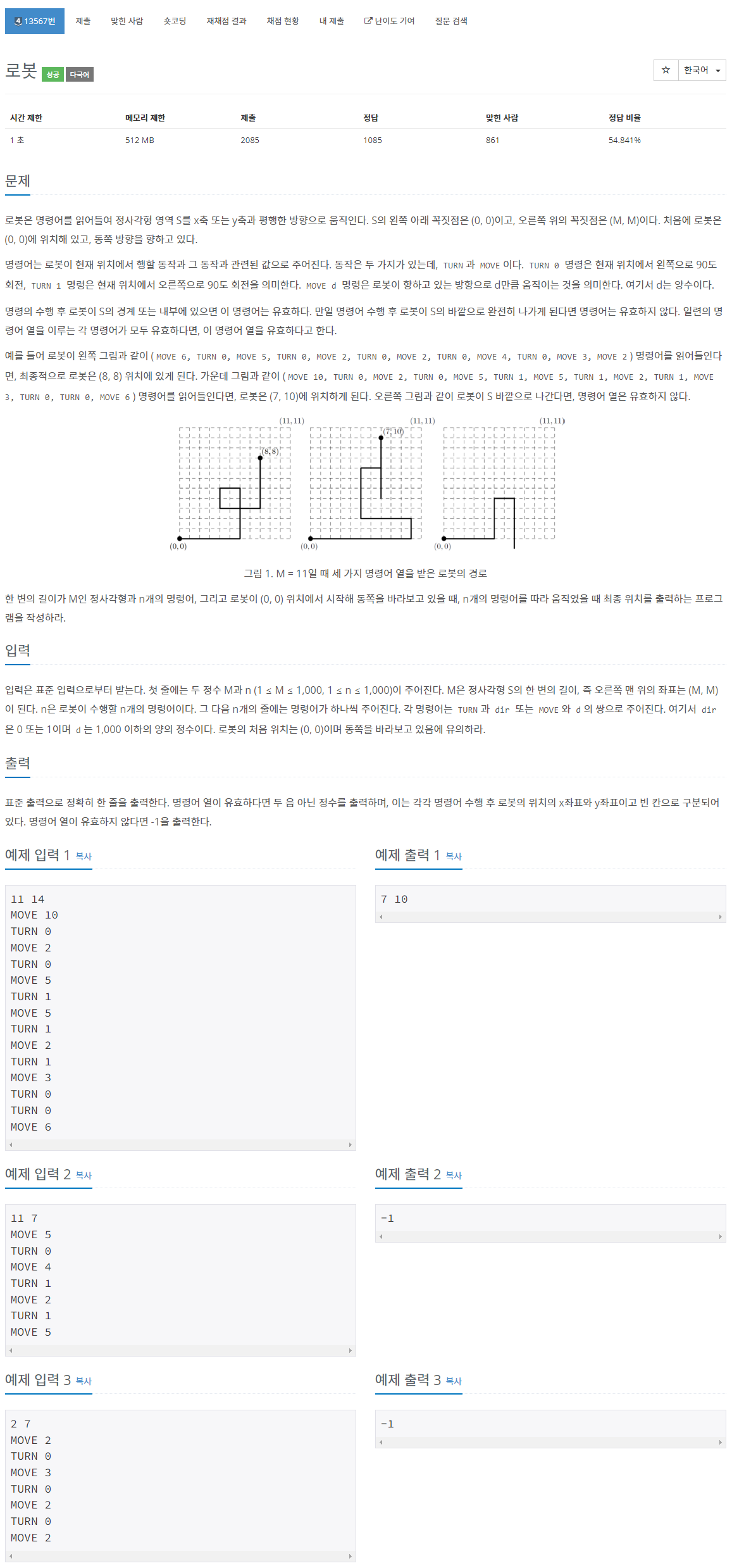 그럼 이제 MOVE X가 입력으로 들어올 경우, 현재 dir을 기준으로 r+=X * DR[dir]; c+=X * DC[dir]; 을 해주면 해당 방향으로 이동한게 된다. MOVE 연산이 끝난 후 r이 음수 혹은 m이상, c가 음수 혹은 m이상이라면 해당 명령어 열은 유효하지 않은 것이므로 '-1'을 출력하고 바로 프로그램을 종료하면 된다. 명령어 열이 유효했다면 모든 연산이 끝난 후 c와 r값을 출력해주면 된다.