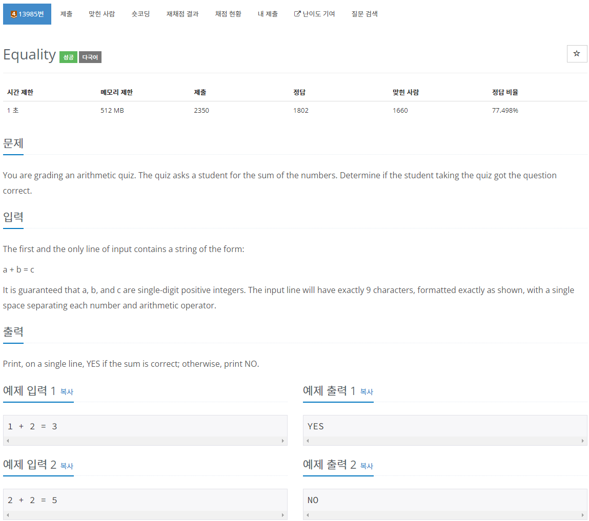 A + B = C 형태의 입력에서, A, B, C를 뽑아낼 수 있다면 풀 수 있다. 심지어 1개의 문자로만 각 숫자가 주어진다고 했으므로 어려울게 없다. character 자체로 판단해도 되고, 어차피 공백으로 구분되어 있으므로 공백을 기준으로 잘라줘도 된다.