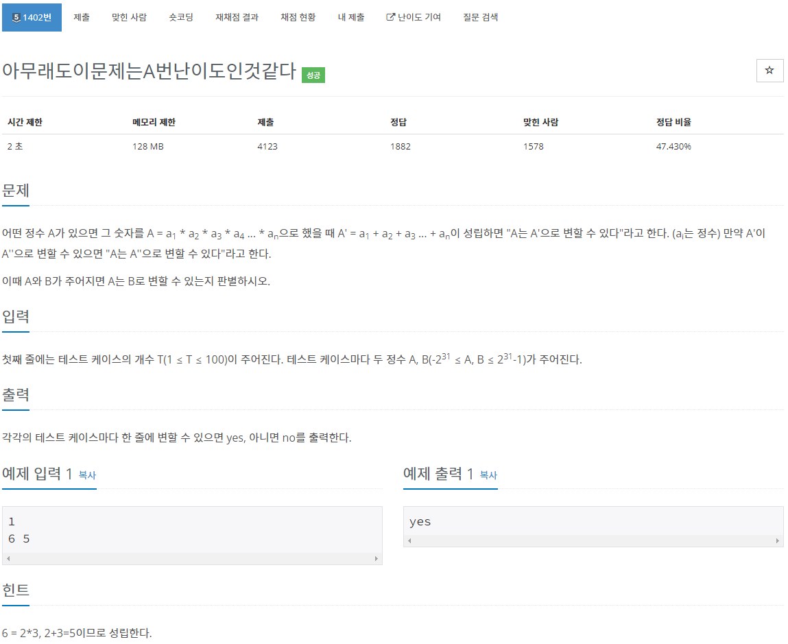 소인수분해도 해주고, 범위가 2^31이니깐 소수(prime number)는 따로 찾아서 계산해줘야 시간초과 안나게 생긴 문제이다. 처음엔 이렇게 생각했는데, 내가 이 문제에서 힌트를 얻은 부분은, A와 B가 음수도 가능했다는 점이다. 약수의 경우 'Divisors can be negative as well as positive, although sometimes the term is restricted to positive divisors. For example, there are six divisors of 4; they are 1, 2, 4, −1, −2, and −4, but only the positive ones (1, 2, and 4) would usually be mentioned.'으로 일반적으로 약수라고 하면 양의 정수로 생각하지만, 음의 정수도 당연히 약수로 가능하다. 보통 양수만 쓸 뿐이다. 하지만 어찌됬든, 알고리즘 문제에서 음수 약수를 요구하는 경우는 거의 없다(1400문제정도 풀었지만 음수인 약수를 구하는 경우는 한번도 없었음.). 그래서 다른 방식으로 생각해봤고, 결과적으로 A와 B를 볼 필요도 없이 모두 yes를 출력해주면 된다.