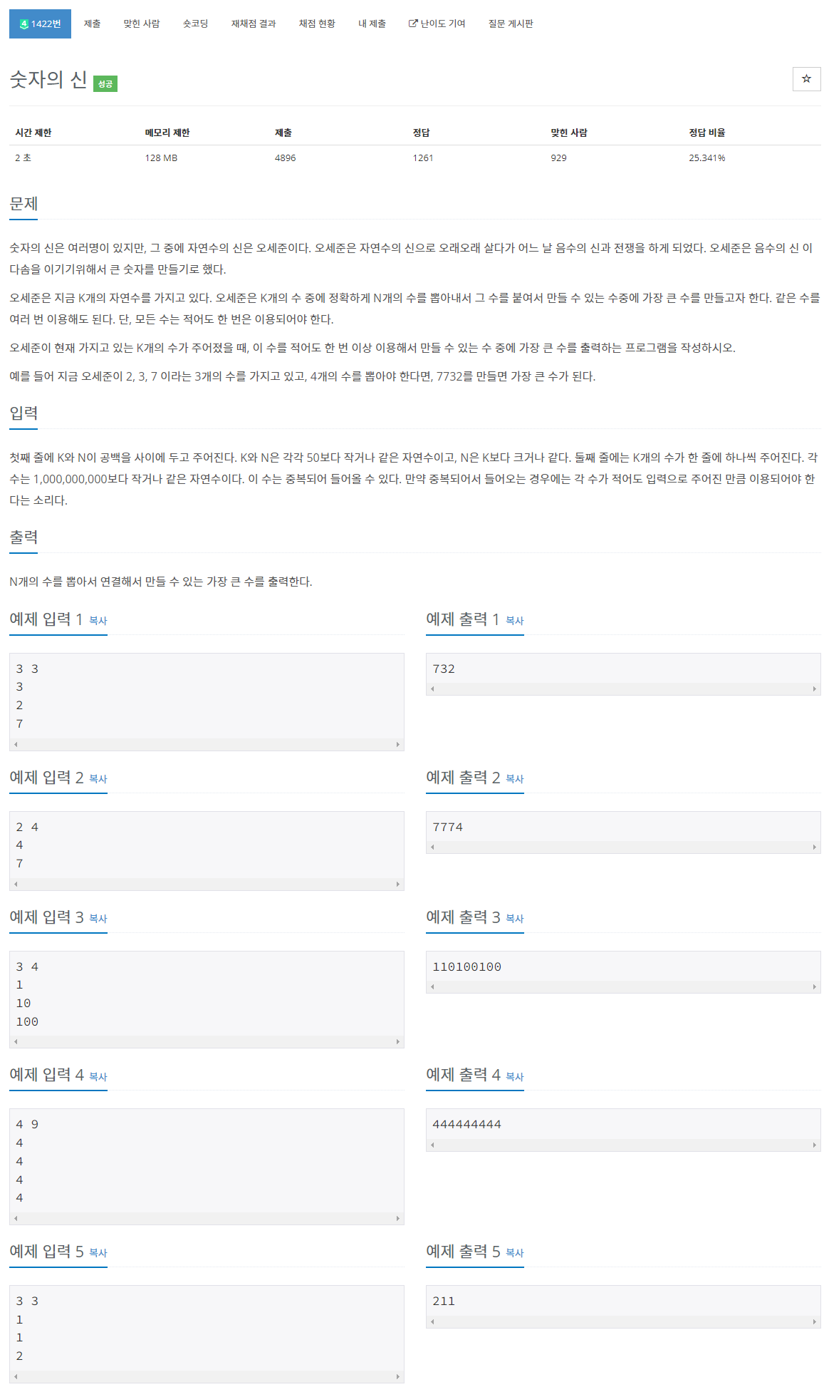 우선 K==N 이라고 생각해보자. 즉, 모든 숫자를 1번씩 배치해서 가장 큰 수를 만들어야 한다. 어떤 수를 먼저 배치하는게 이득일까? 어차피 만들어진 수의 자리수는 K개의 숫자들의 자리수의 합과 동일하다. 따라서 단순히 큰 수가 먼저오는건 의미가 없다. 예를들어 1과 100 중에 크다고 100을 앞에 두면 1001이지만, 1을 앞에둔 1100이 답이다.