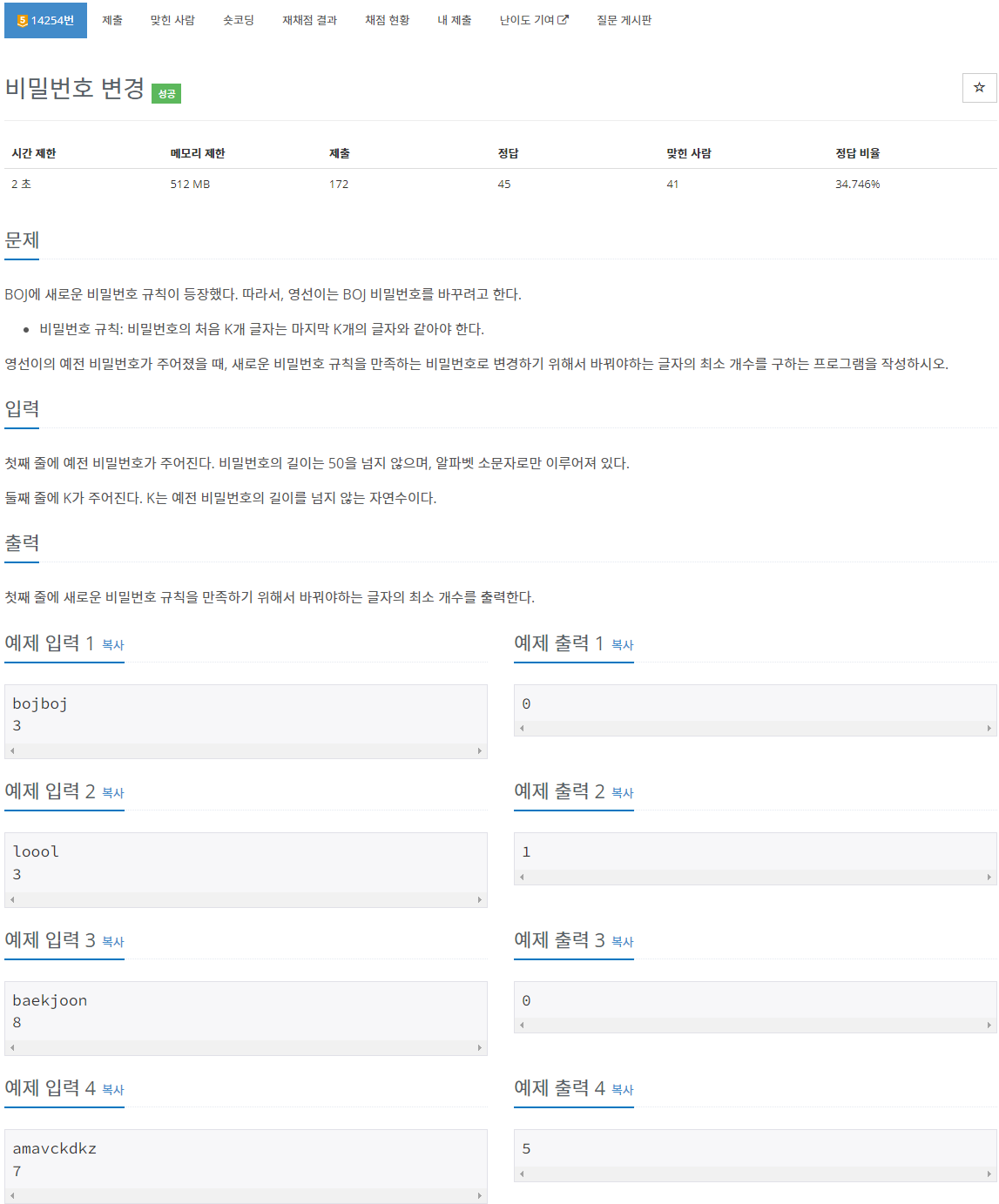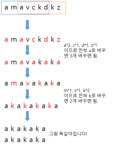 그렇다면 위에서 말한대로 '전체 문자열의 길이 - k' 씩 건너띄면서 그 중 가장 많이 나온 문자로 전부 바꿔버리는 식으로 하면 영향도를 파악해 가장 효율적인 방식으로 바꾼게 된다. 이걸 영향도 파악이 되지 않은 문자갯수만큼 진행하면 된다. 영향도 파악이 되지 않은 문자갯수또한 '전체 문자열의 길이 - k'개 이다. 예제 입력 4의 경우 9개 문자 중 k가 7이므로, 앞에서 2개의 문자까지만 2개씩 건너띄며 진행하면 된다.