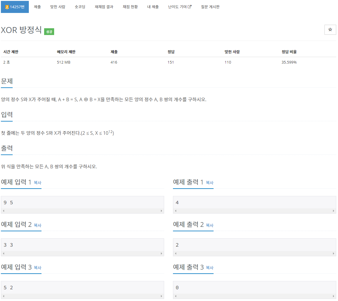 최종적으로 2의 cnt승이 답이된다. 이 때 S와 X가 동일한 수일 경우, A 또는 B가 0인 경우가 존재할 수 있다. 근데 문제에서 '모든 양의 정수 A, B' 라고 했으므로 이 경우를 빼줘야 한다.