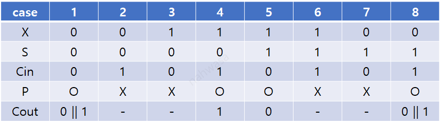이하 표에서 X는 현재 보고 있는 X의 비트값이다. S는 현재 보고 있는 S의 비트값이다. Cin은 이전 자리수로부터 carry가 0인지 1인지를 뜻한다. 이 3가지를 기준으로 봤으므로 총 8가지 경우가 있다. P는 가능 여부이다. O면 해당 X,S,Cin에 맞춰 A와 B의 해당 자리수를 만들 수 있음을 나타낸다. Cout은 해당 경우 다음 자리수로 carry가 넘어가는지를 나타낸다. 0||1 이면 넘길수도 있고 안넘길수도 있음을 나타낸다.