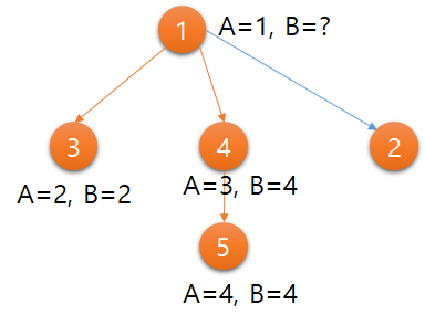 하고자 하는건, dfs 방문 순서대로 새로운 번호를 매기면서 각 노드에 칭찬이 들어왔을 경우 새로운 번호를 기준으로 연속된 범위를 지정하려는 것이다. 지정된 범위가 [A, B]라고 하자. A는 당연히 dfs로 방문해 해당 노드에 새로 부여된 번호에 해당될 것이다. B는 해당 노드가 범위를 끼치는 부하들에 해당하게 된다. 그럼 다음 그림처럼 진행하면 된다. 코드의 initNumAndRange()를 참고해보자.
