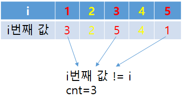 n개를 입력받으면서, i번째 입력값이 i가 아니라면 cnt라는 값을 증가시켜준다. 최종적으로 cnt값을 출력해주면 된다.