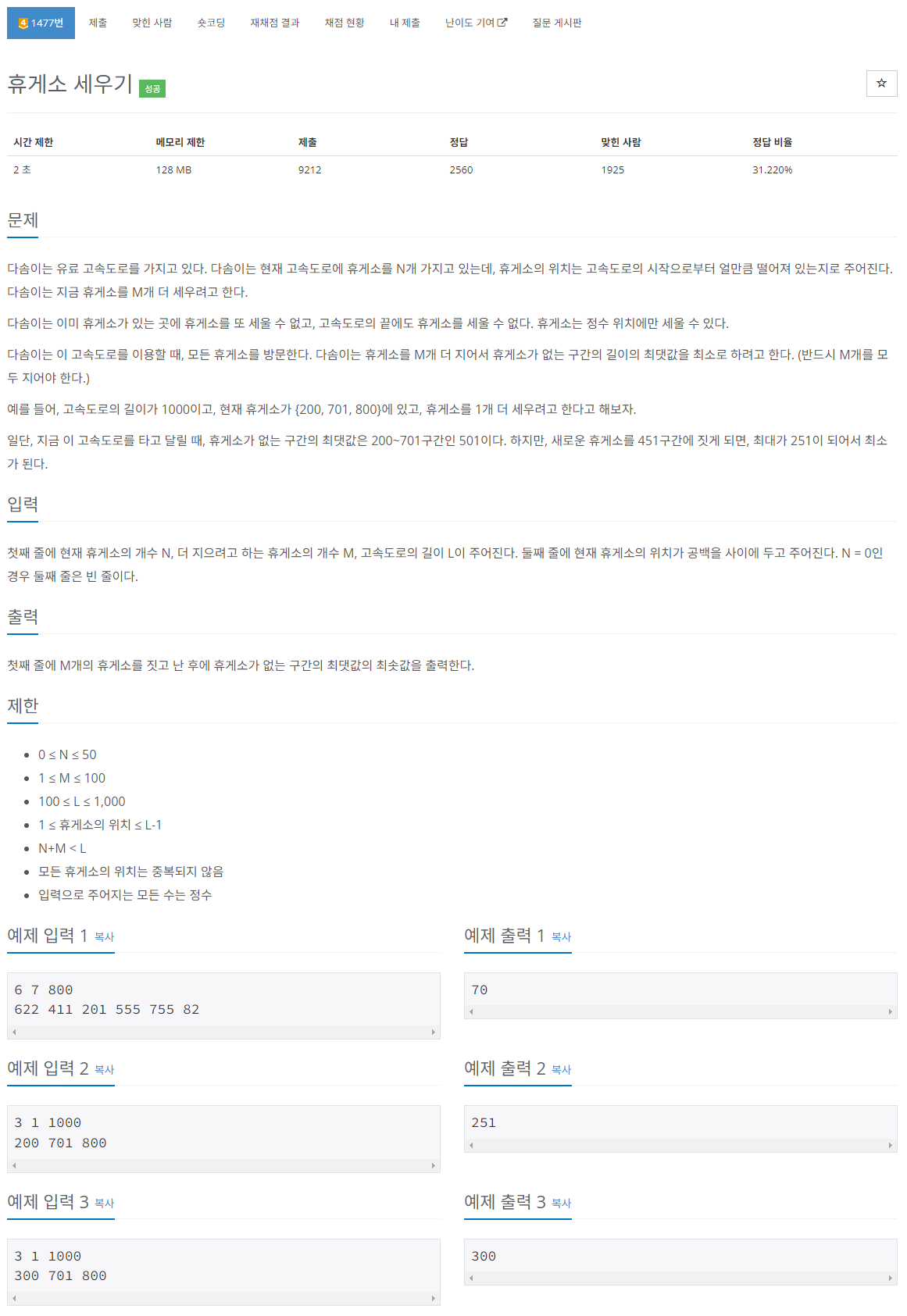 그러니 약간 생각을 바꿔서, "M개 이하의 휴게소를 더 지었을 때 휴게소가 없는 구간의 길이가 'X'이하로 가능한가?" 를 생각해보자. 이 경우엔 생각보다 간단하다.