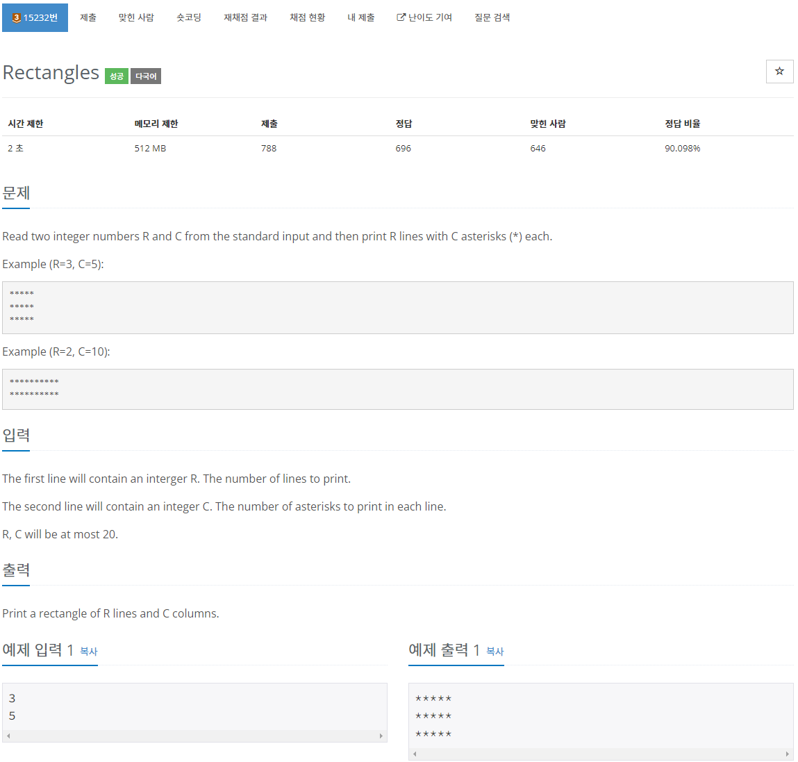 R과 C를 입력받아, C줄에 걸쳐 각각 한줄에 R개의 '*'을 출력해주면 된다. 알고리즘 문제라기보단 단순 구현문제로, 입출력을 어떻게 하는지 한번 생각해보자. 위 '자바로 백준 풀 때의 팁 및 주의점' 링크를 보면 좀 더 효율적으로 입출력을 해볼 수 있다.