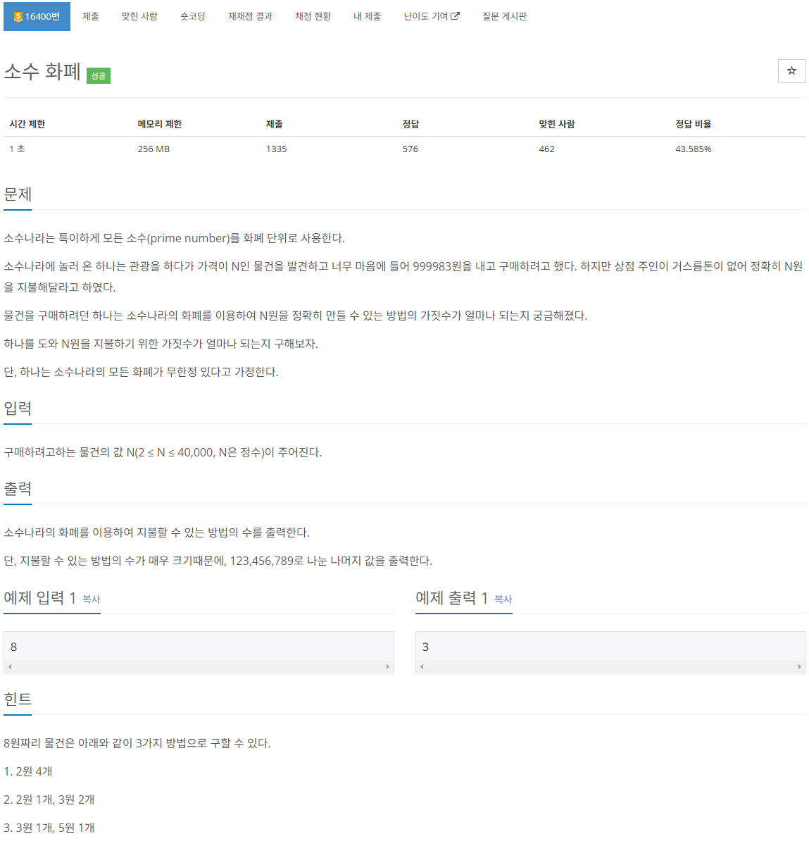 - 에라토스테네스의 체로 소수를 전처리 후, 냅색 DP를 돌려서 풀 수 있다.