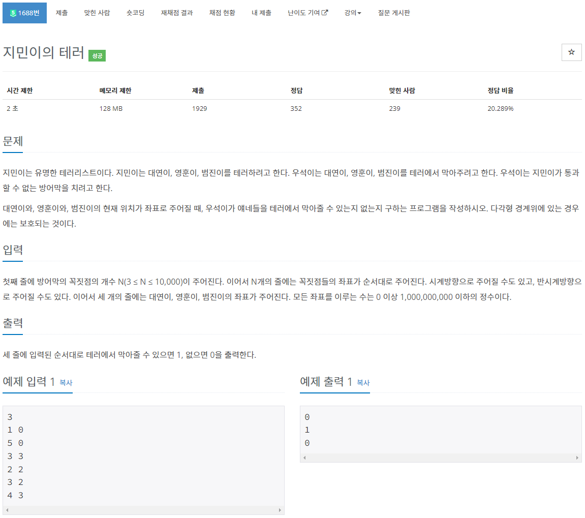- 딱히 어려운 부분은 아니다. 선분 교차 판정의 응용으로, 풀이를 보면 어떻게 판정하는지 바로 알 수 있다.