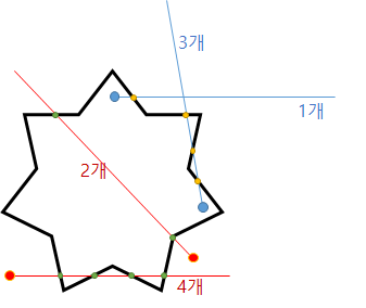 선분 교차 판정을 안다면 오목 다각형 내부의 점 판정은 그리 어렵지 않은데, 그냥 외부 무한대 위치로(입력값 최대치 이상) 선을 쭉 그어서 선분 교차판정을 한 결과가 홀수면 오목 다각형 내부에 있는거다. 이하 이미지에서 다각형 내부의 파란 점들은 외부로 어디로 선을 긋든 홀수개 위치에서 만나고, 다각형 외부의 빨간 점은 짝수개 위치에서 만나는걸 확인할 수 있다.