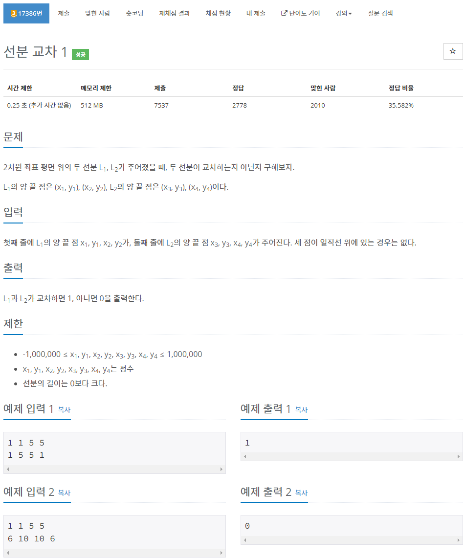 - 선분 교차 판정 (기하학, CCW)