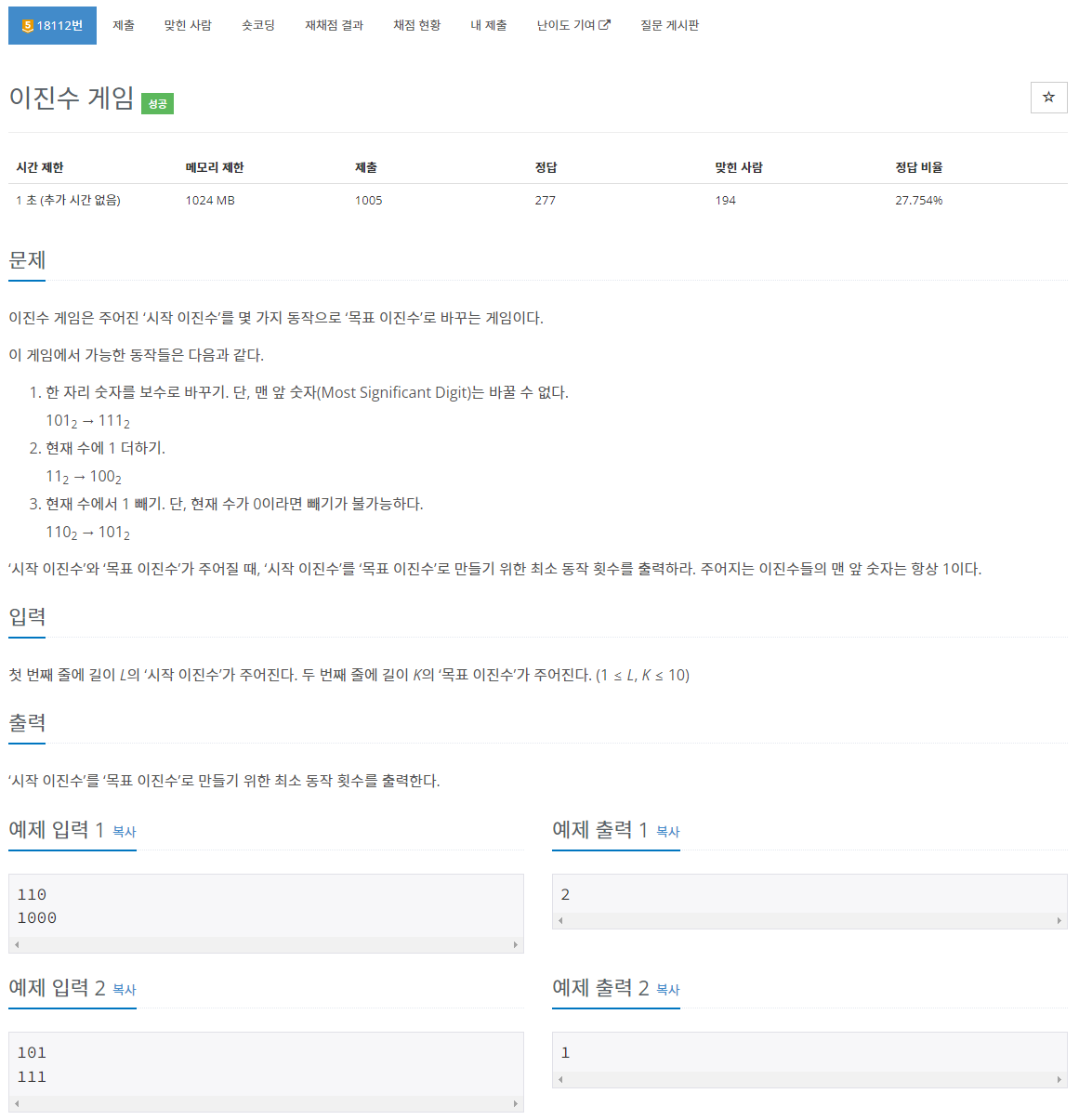 - 시작 이진수부터 목표 이진수까지 문제에서 제시된 동작들을 통해 순회하며 BFS를 진행하는 문제이다.