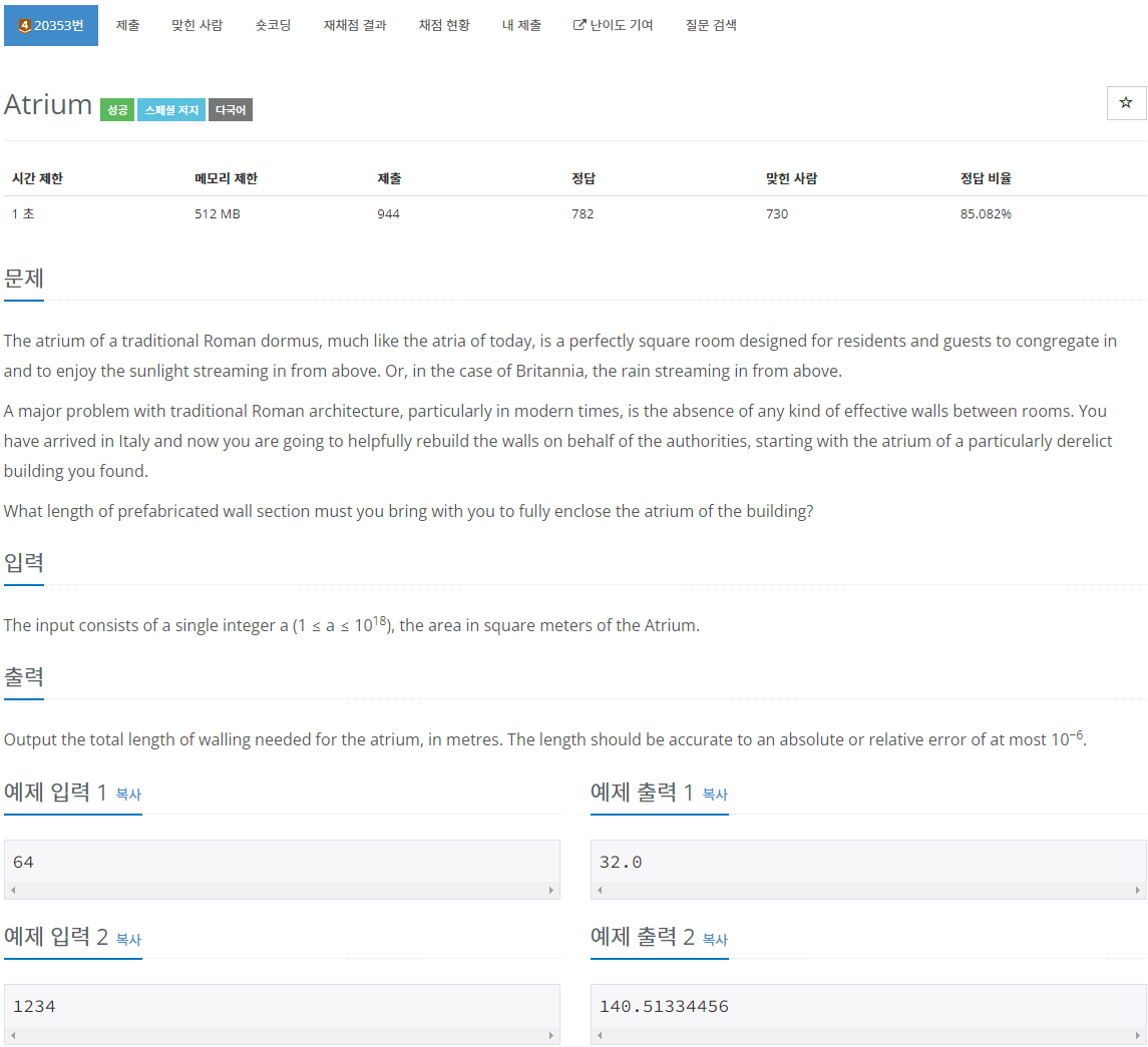 정사각형의 넓이는 한 변의 길이의 제곱으로 구할 수 있다. 한 변의 길이를 x라 한다면 넓이는 x^2이다. 이 문제에서는 넓이가 주어지고, 원하는건 4x 이다. 따라서 '4*sqrt(입력으로 주어진 넓이)'을 출력해주면 된다. 자바에서 제곱근은 Math.sqrt()로 구할 수 있다.