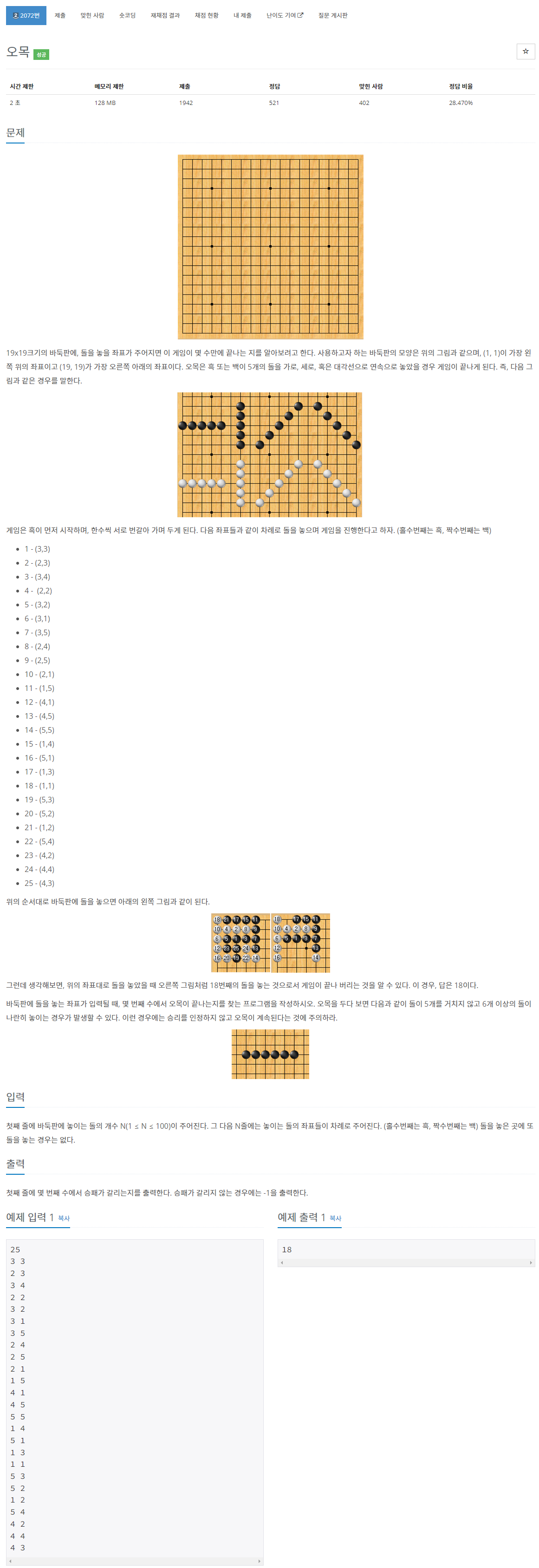 문제에 제시된대로 구현만 해주면 되는 문제이다. 19x19 짜리 오목판이므로 배열을 두고, 흑과 백에 각각 특정 값을 주고 순서대로 배열에 넣어주면 된다. 그리고 넣어준 값을 기준으로 5개가 연속되도록 넣여져 있는지 확인해주면 된다.