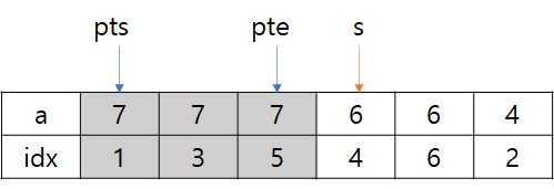 코드 기준으로 동일한 양에서 가장 idx가 낮은걸 가르키는게 pts, 높은걸 가르키는게 pte이다. s는 다음으로 많은 양을 미리 가르킨다. 현재 가장 큰 a는 7 이므로 처음엔 다음과 같이 된다. 그럼 이제 7의 배수를 만나기 전까진 pts를 증가하면서 idx를 출력하고, 7의 배수를 만나면 pte를 감소하면서.. 다시 7의 배수를 만나면 pts를 증가하면서.. 처럼 진행하면 된다.