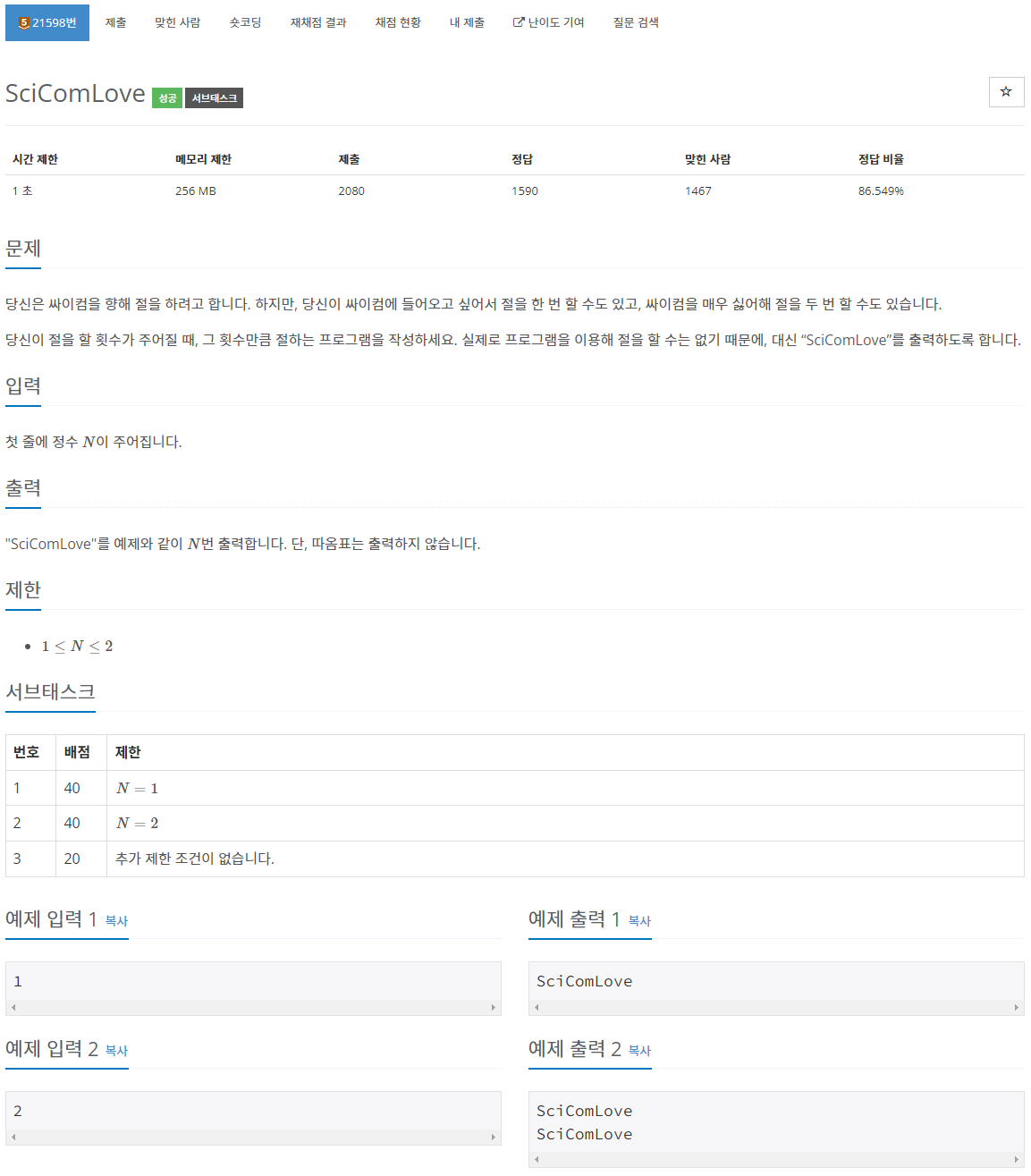 주어진 N의 횟수만큼 "SciComLove"를 출력해주면 된다. 백준에서 문자열 출력하는 연습을 해보자!