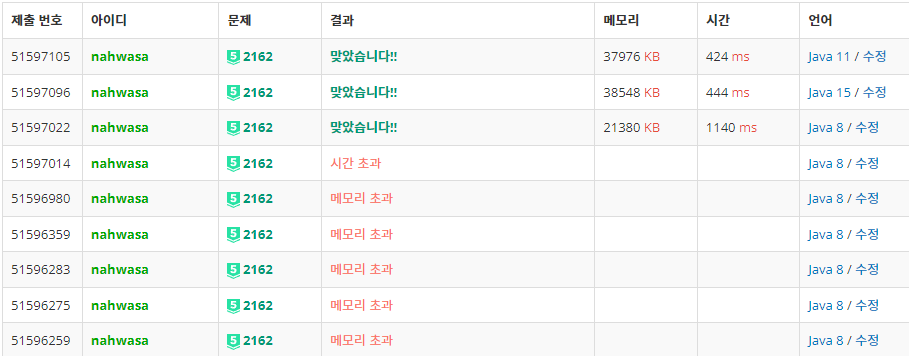 주의점은 자바8로 제출 시 메모리 초과가 날 가능성이 있으니 자바9 이상으로 제출하자.