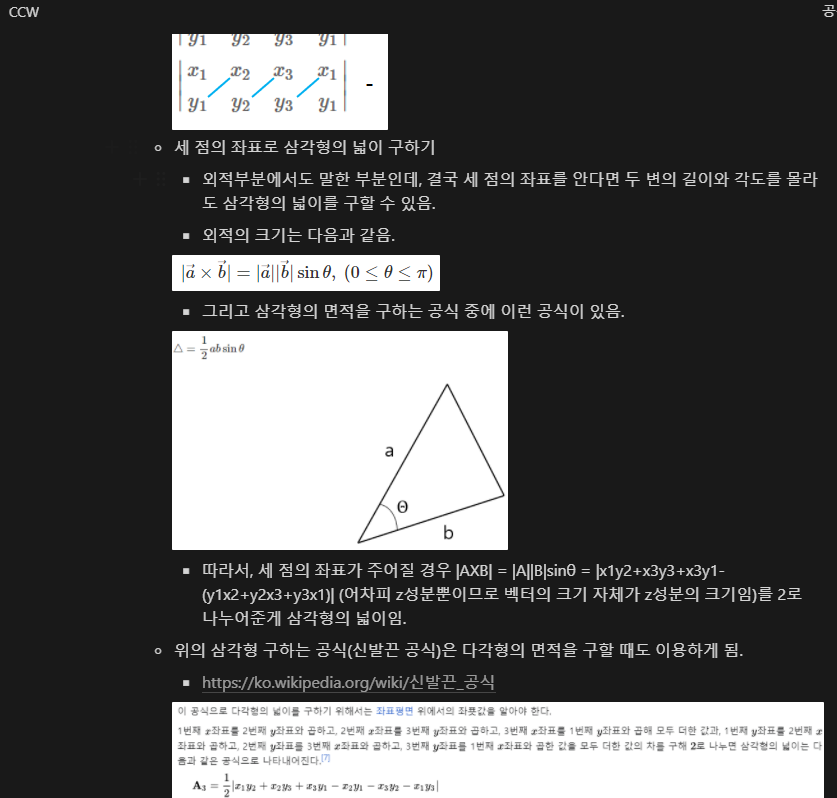 이 문제는 기하학의 사칙연산이라 불리는 CCW를 다양한 블로그 보면서 공부하고 있던 중에 만난 신발끈 공식으로 풀 수 있는 문제였다. 이하 노션에 개인 공부용으로 정리중인 벡터의 외적 및 CCW 내용이다.