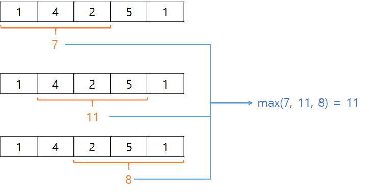 저 X칸짜리 주황색 부분을 옆으로 그대로 움직이듯이 움직이므로 '슬라이딩 윈도우' 라고 부른다. 처음 이미지에서 합은 7이었고, 옆으로 한칸 밀 땐 새로 들어온 '5'를 더하고, 빠지는 '1'을 빼주면 된다. 즉, 7+5-1 = 11 이다. 이런식으로 주황색 부분의 합 중 가장 큰 값이 답이 된다.
