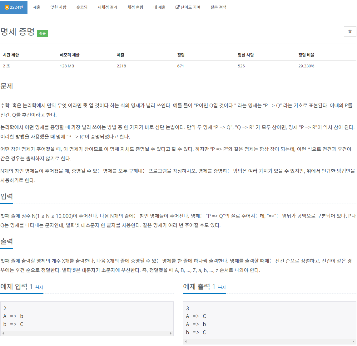 a => b 형태일 경우, a에서 b로 가는 간선을 연결하는 것으로 생각해보자. 그리고 a~z, A~Z를 모두 숫자로 변경하자. 이 때 변경방식은 A~Z를 0~25, a~z를 26~51로 하면 된다. 그래야 출력 시 순서대로 출력해주기가 편하다. 변경 방식은 코드의 atoi, itoa를 참고하자.