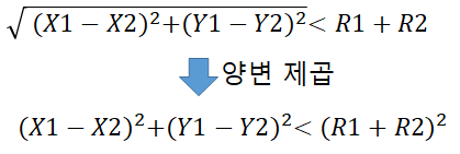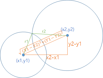 if (1l*(x-x1)*(x-x1)+1l*(y-y1)*(y-y1) < 1l*(r+r1)*(r+r1)) {