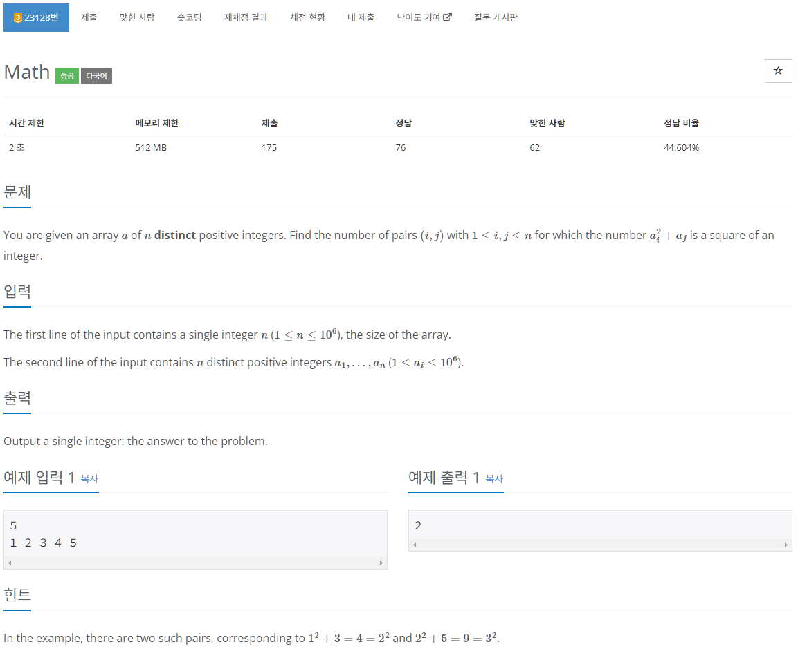 여기서 A, B의 범위는 [1, 1000000] 이다. 따라서 임의의 C를 구하더라도, C^2 - A^2 은 양수여야 하고, 가능한 최대값은 100만이다. 이 경우 최악의 경우인 A가 1인 경우에도 C^2의 최대치는 100만-1 이면 되므로, 어차피 대충 1000번정도만 살펴보면 됨을 알 수 있다. 즉, 기존 수식을 살짝 바꿔 한쪽을 제곱이 아닌 녀석으로 교체하면서 범위를 제한하는 아이디어가 필요한 문제였다.