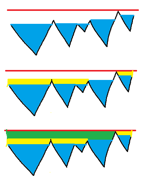 근데 Add를 하면 인접한 같은 수도 같이 증가하므로, 모든 A[1], A[2],... 에 대해 각각 계산하면 안되고, V자 모양으로 꺾여있는 부분의 가장 아래부터 시작해 평탄화(?) 작업을 해야 한다. 즉, 아래그림처럼 V 자 모양 꺾이는 부분부터 점점 올라오면서 주변에 인접한 동일한 값을 한꺼번에 증가시키면서 진행해야한다.