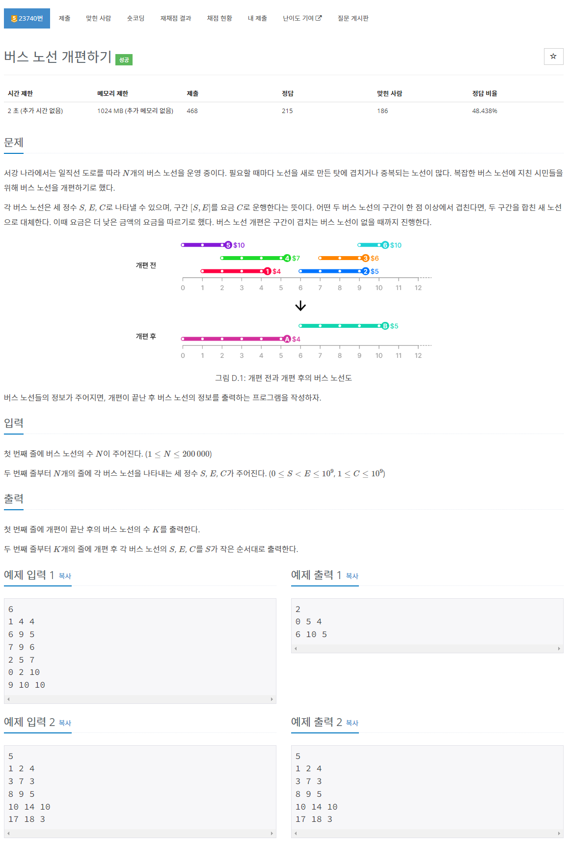 두 노선 A와 노선 B를 합칠 경우 새로운 노선 C는 A와 B 중 작은 s값, A와 B 중 큰 e값, A와 B 중 작은 c 값을 가지는 새로운 노선이 될 것이다. 마찬가지로 s가 증가하는 순서대로 보고 있으므로, e와 c만 판단하면 된다.