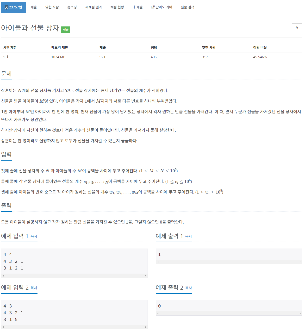 위의 로직이 M개의 w값에 대해 모두 진행 가능하다면 1을 출력해주면 된다