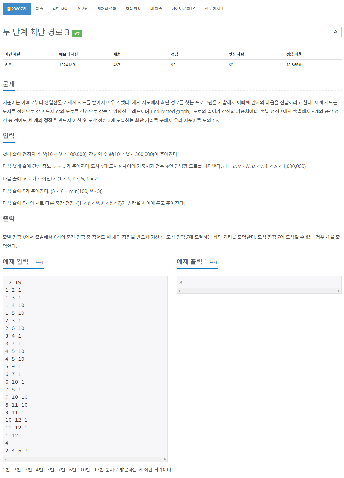 그렇다면 'x -> P개의 중간지점 중에 3개 선택 -> z' 중에 최단거리를 구하면 될 것이다. 그리고 P개의 중간지점 중에 3개를 선택하는건 100P3 이므로 970,200 가지 경우만 보면 된다. 러프하게 생각해서 이렇게 구하면 되는데, 왠지 안될 것 같이 생겼는데 시간 제한이 6초라 된다 ㅋㅋ. 즉 이게 풀이다.