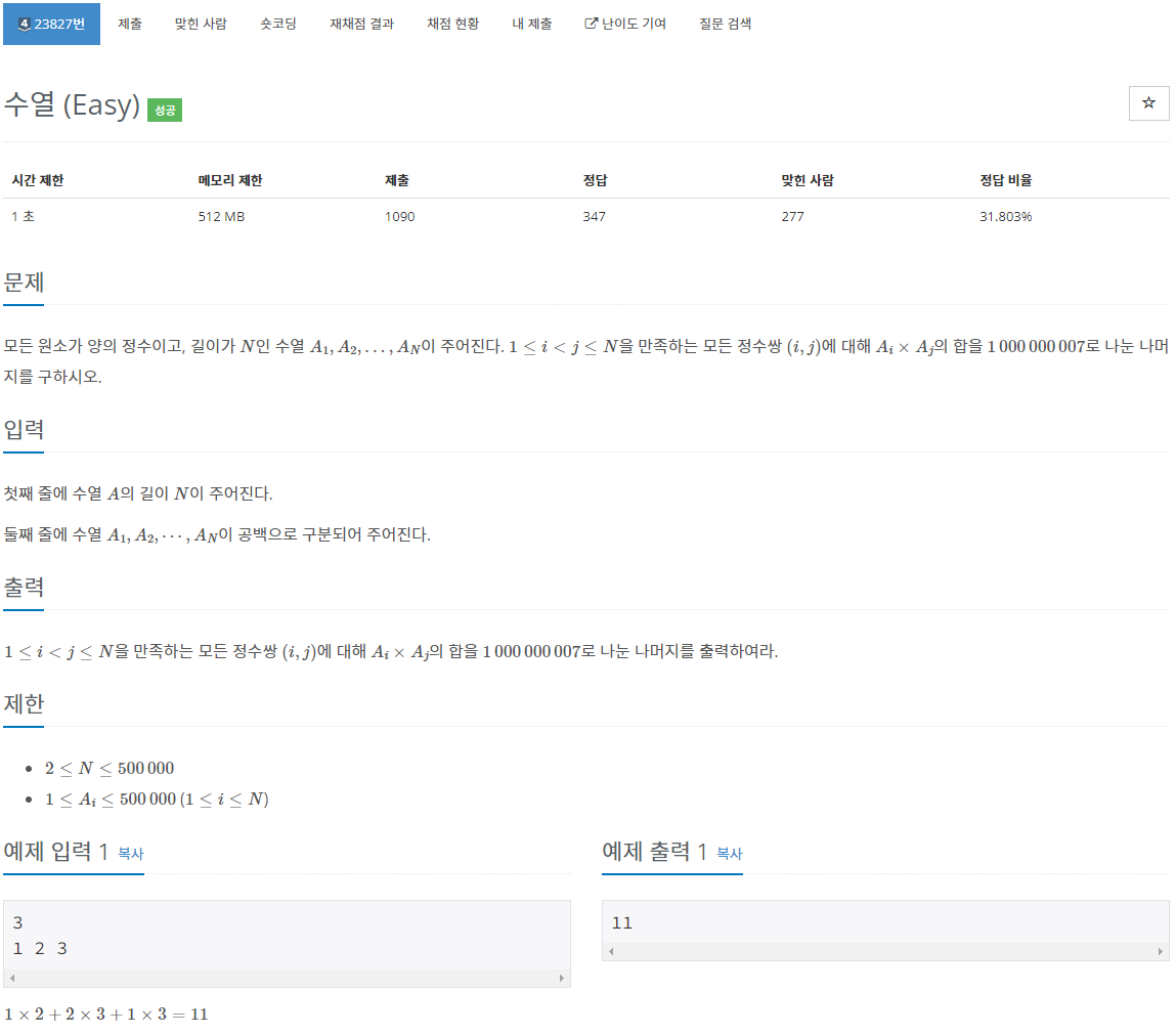 그럼 우측 시그마 부분만 prefix sum으로 계산해둔다면 전체를 O(N)으로 처리할 수 있게 된다. 이 때 prefix sum을 거꾸로 진행하면(prefixSum[n] += prefixSum[n+1]) 위 수식의 우측 시그마를 바로바로 구해줄 수 있다.