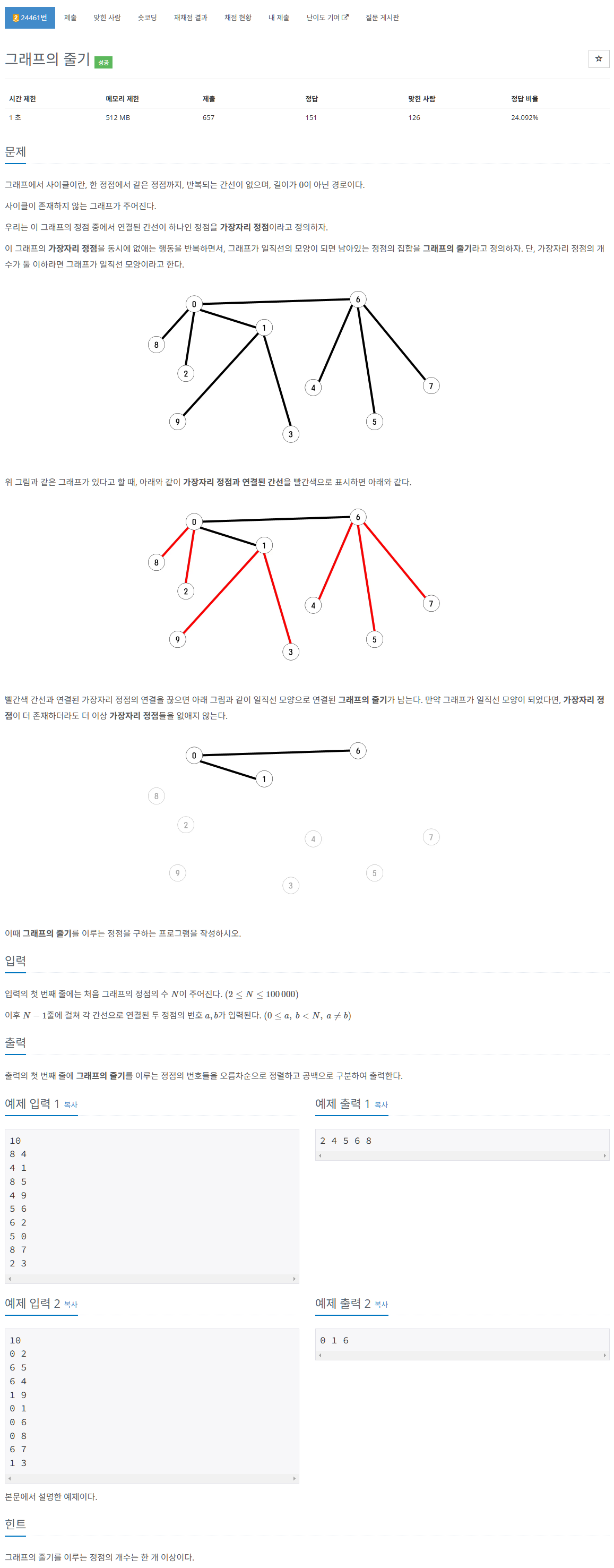 한 번 삭제된 후엔 아래와 같이 된다. 그리고 그래프의 줄기가 남게되므로 종료된다. 그래프의 줄기만 남는 경우는 모든 정점들이 연결된 간선이 2 이하일 때 이다.