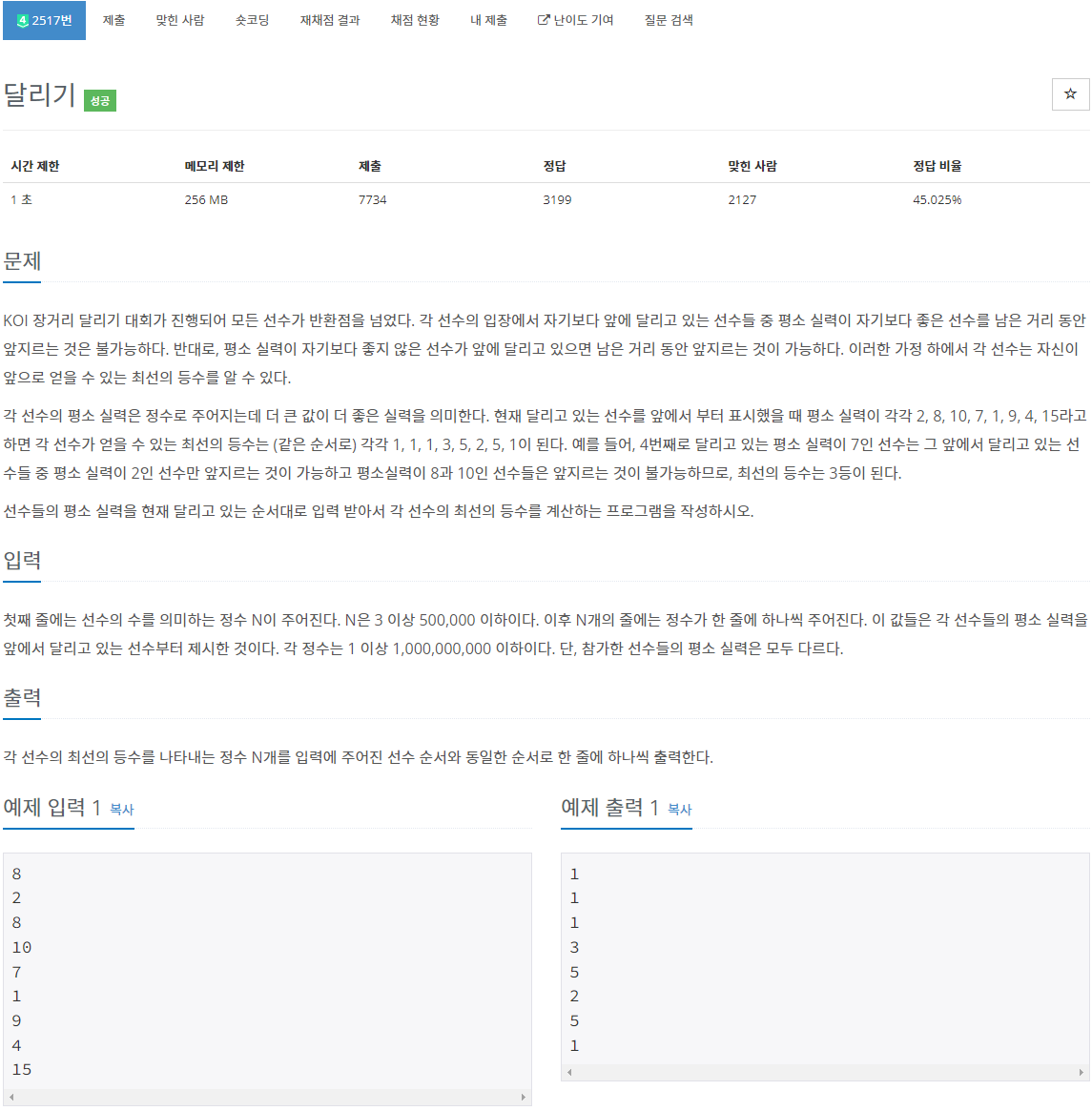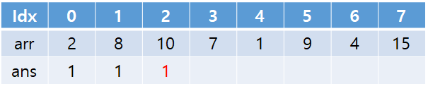 자신보다 실력이 좋은 사람은 이길 수 없다는 조건이므로, 배열의 각 위치에서 이전에 나온 자신보다 더 큰 값의 수 + 1이 최선의 등수이다. 평소 실력이 각각 2, 8, 10, 7, 1, 9, 4, 15일 때를 생각해보자. ans는 자신보다 idx가 작은 위치에서 자신보다 arr[idx]의 값이 더 큰 수 + 1로, 최선의 등수를 뜻한다. 이하 idx 0부터 7까지의 ans를 구하는 과정이다.