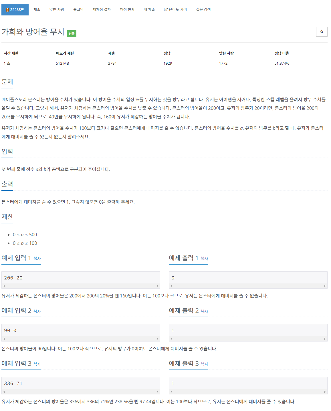 a와 b를 입력받은 후, a에서 b%를 제외해준다. 즉, a - a*(b/100) 를 해준다. 이 값이 100 이상이면 0, 아니면 1을 출력해주면 된다. 주의점은 실수로 계산을 해줘야 한다. 내 경우엔 1d 라는게 있는데, literal로 double 1.0을 의미한다. 그리고 자바에서는 이항연산자들 중 하나라도 double이면 double로 연산이 되므로 1d*b도 double로 되고, /100도 double로 되고, a를 곱하는 부분도 double로 연산된다. 좀 더 명시적으로 하려면 '(double)'을 사용해 캐스팅을 해서 계산할 수 있다.