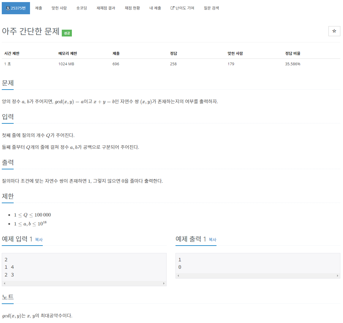 a, b가 최대 10^18 이므로 당연히 x, y를 직접 찾아낼 순 없다. 그렇다면 수학적인 추론이 필요할 것임을 예측할 수 있다. 수학적으로 매우 약하기 때문에 내 경우엔 우선 간단히 생각해낼 수 있는 부분을 생각해봤다. gcd(x,y) = a 라면 당연히 x와 y는 각각 a로 나누어 떨어진다. 그렇다면 x+y 역시 a로 나누어 떨어진다(x+y = a(x'+y'), x', y' 모두 자연수 일 것이므로). 따라서 b가 a로 나누어 떨어져야만 한다. 그리고 추가로 생각해볼게, gcd(x, y) = a라면 당연히 x>=a, y>=a 여야 한다.