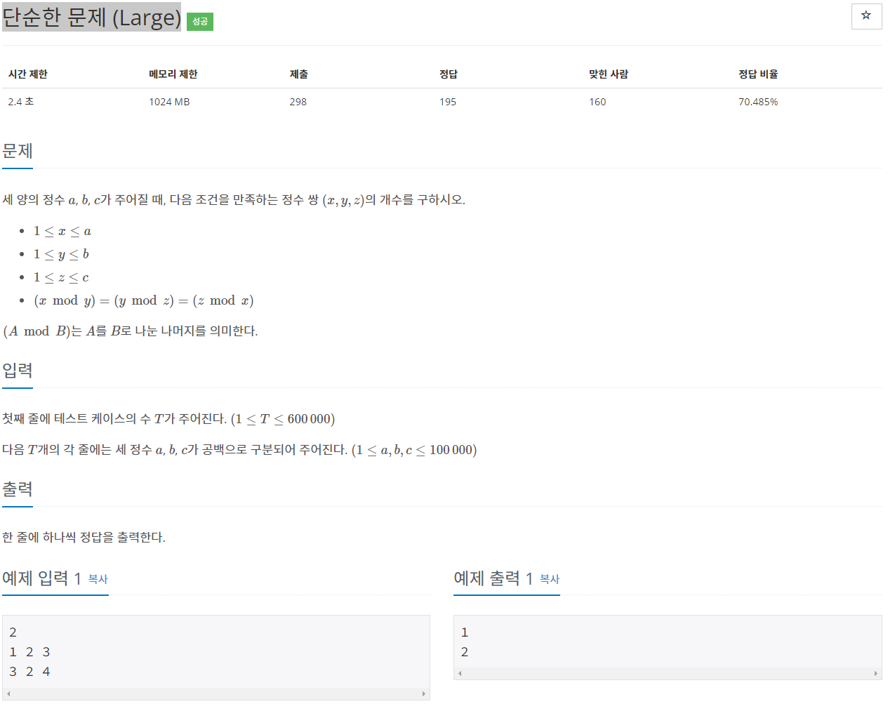 1. (x mod y) <= x (당연히 x를 y로 나눈 나머지인데 x보다 클 순 없다), (y mod z) <= y, (z mod x) <= z 이다.
