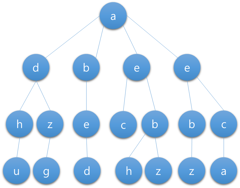 4. 진행 가능한 곳은 a 하나이므로 다음 진행은 a로 간다. 같은 깊이에 u,g,d,h,z 다양하지만 그 이전 문자가 더 작으므로 모두 의미가 없다.
