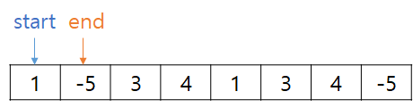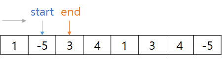 그리고 배열의 모든 위치에 대해 start와 end를 동시에 우측으로 진행하면 된다. 슬라이딩 윈도우 때와 마찬가지로 새로 end가 가르키게 되는 값을 더하고, start가 가르키는 값을 빼주면 된다. 역시 마찬가지로 O(N)에 답을 구할 수 있다.