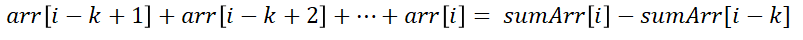 prefix sum (누적합)을 미리 구해둬보자. 누적합 배열을 sumArr이라고 하고, sumArr[i]는 arr[1]+arr[2]+...+arr[i] 라고 하자. 그렇다면 sumArr[i] = arr[i] + sumArr[i-1]이 될 것이다. 이렇게 누적합 배열을 구해둔다면, 이후 아래의 공식을 통해 각각 O(1)로 arr[i]부터 이전 K개의 합을 구할 수 있다. 따라서 O(N)으로 답을 구할 수 있다.