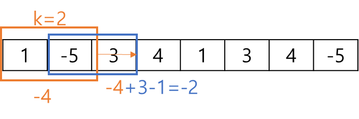 이 때, 윈도우가 오른쪽으로 한칸 움직이면 어떻게 하면 될까? 새로 윈도우에 포함되게 된 맨 오른쪽의 값을 더하고, 윈도우에서 빠지게 된 값을 빼주면 그 다음 위치의 합을 구할 수 있게 된다. 따라서 O(N)에 답을 구할 수 있다.